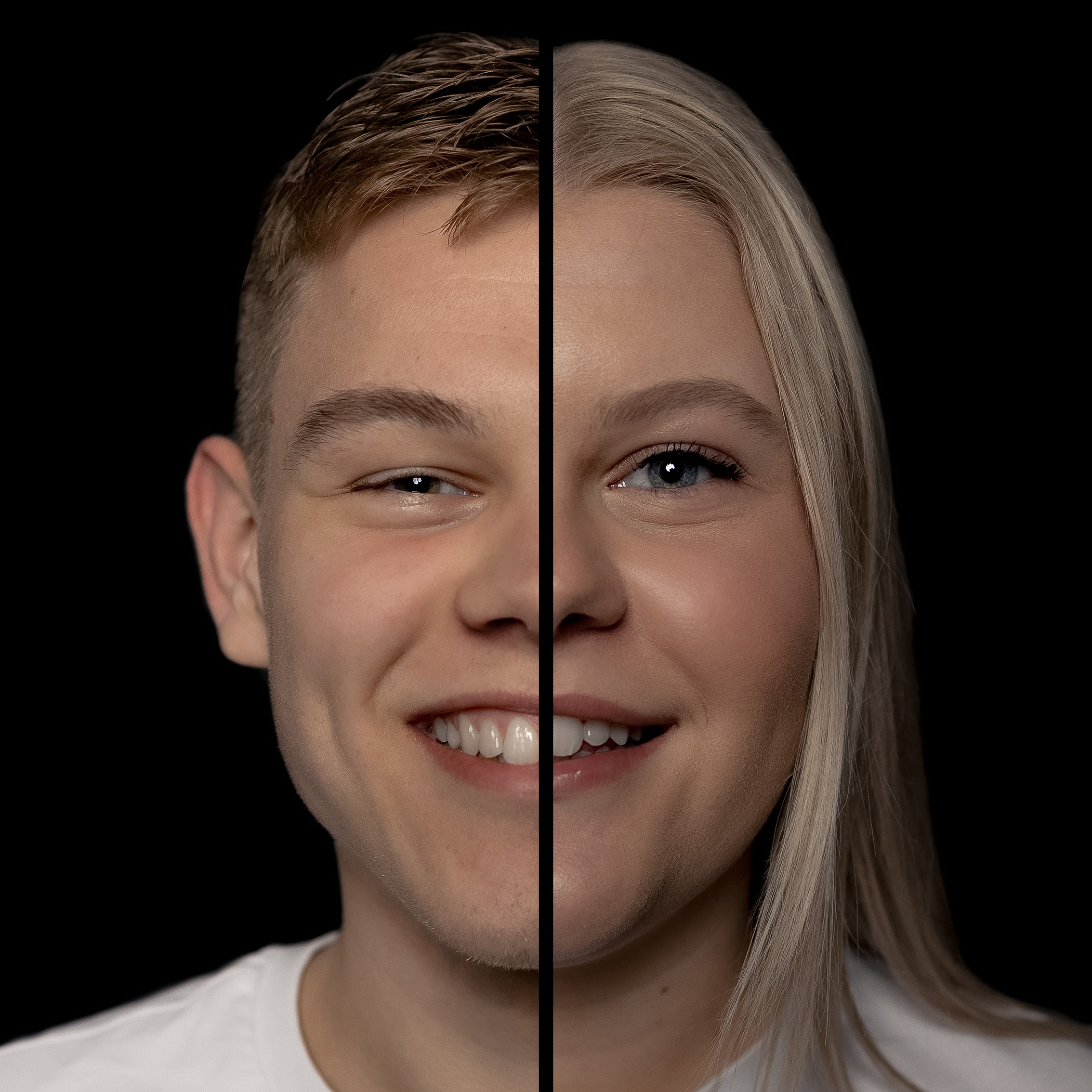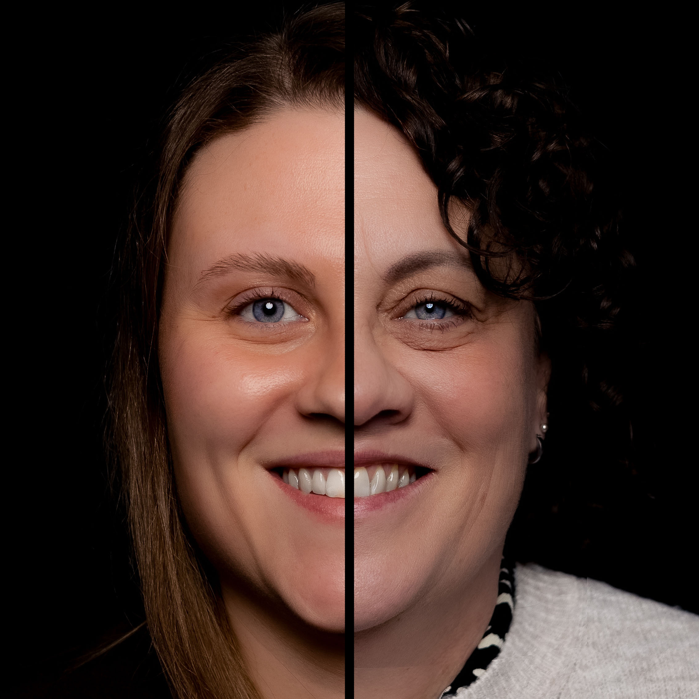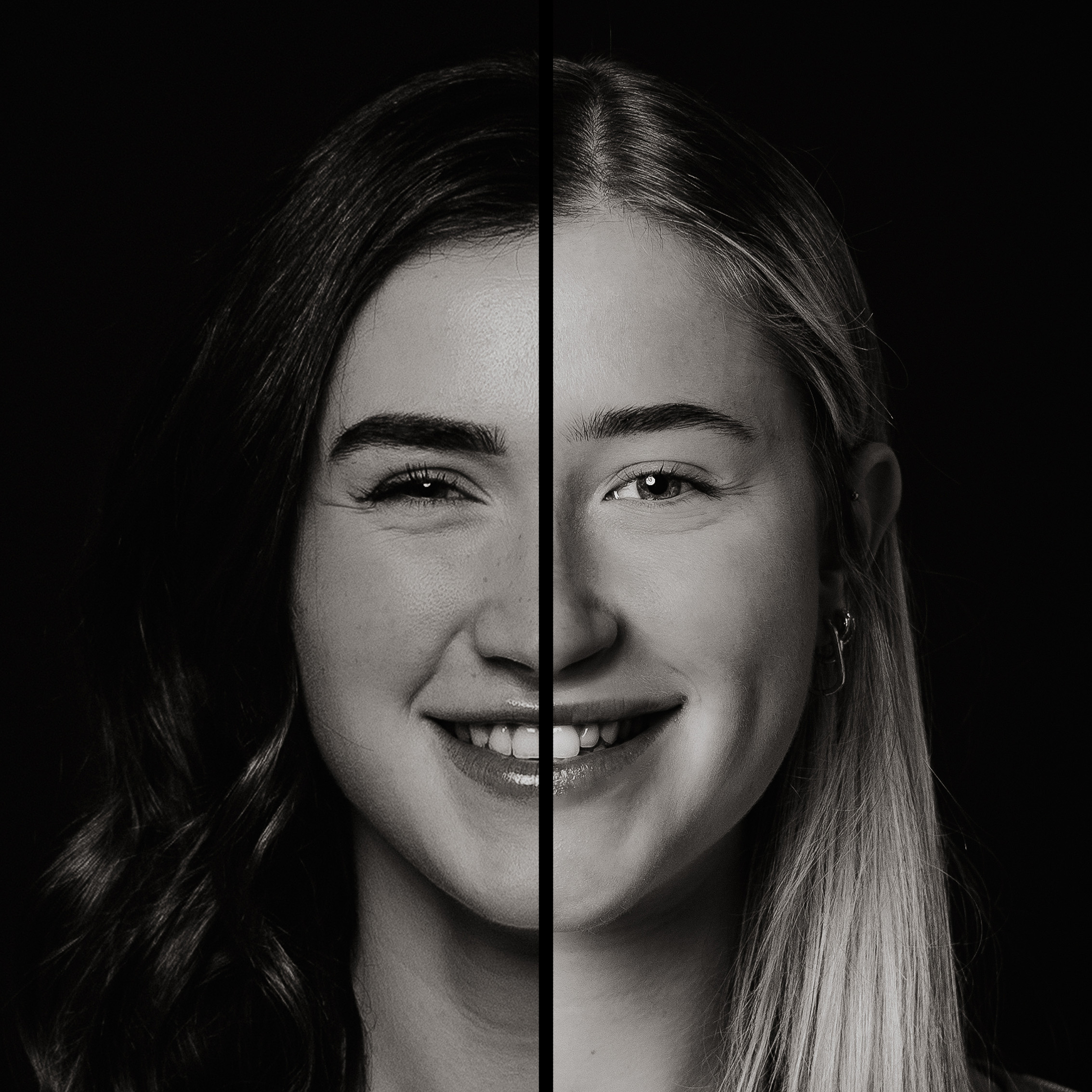 Met het 2-in-1 portret staan jullie gezichten naast elkaar met een zwarte lijn ertussen. In het duo portret staan de helften van jullie gezichten aan de buitenkant van het beeld. Scroll naar beneden voor de voorbeelden.